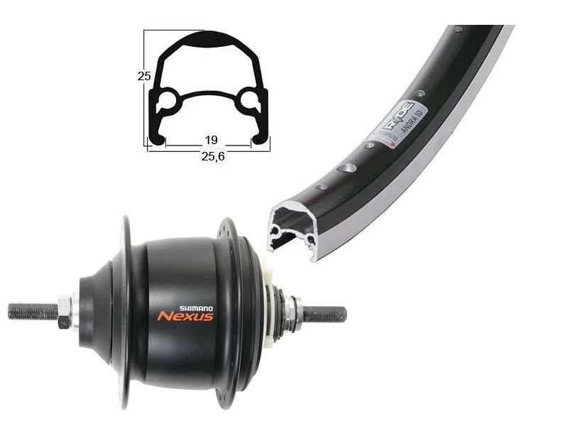 fertig eingespeicht mit 2.3-2.0mm ED teilverstärkten silbernen Edelstahlspeichen und silbernen Messingnippeln (Speichenlänge 245 mm)