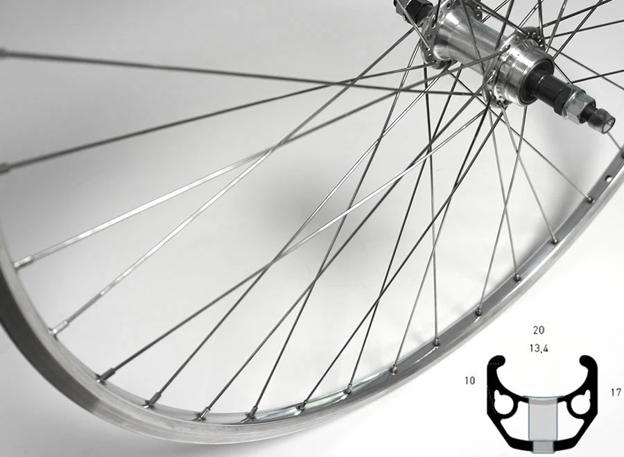 eingebaut sind 36 silberne Alpina Nirosta Edelstahlspeichen 2.00 mm dick (3-fach gekreuzt eingespeicht)