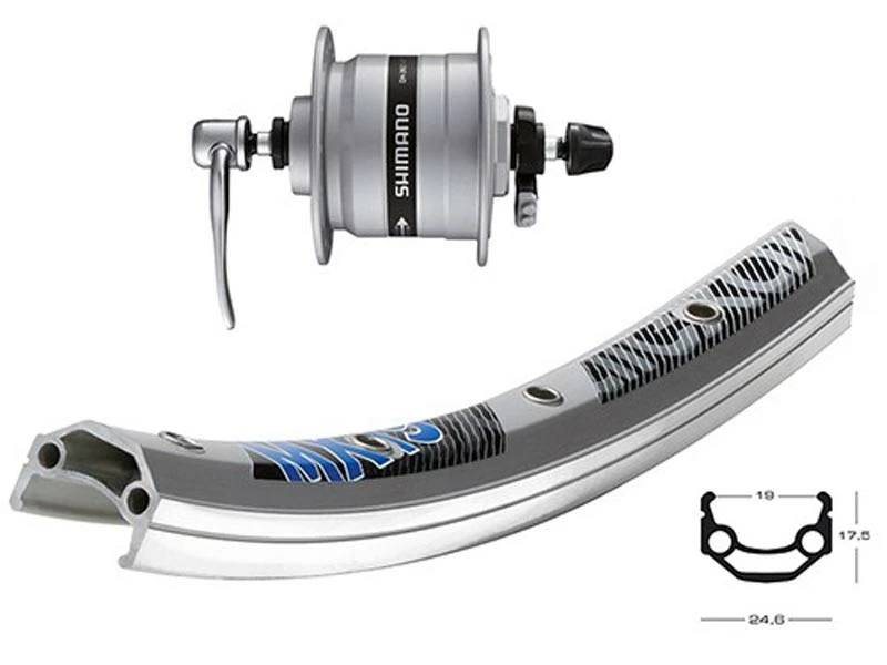 Nabe: Shimano Vorderradnabe mit Nabendynamo DH-C3000 silber mit Hohlachse und Schnellspanner, Gabel-Einbauweite 100 mm