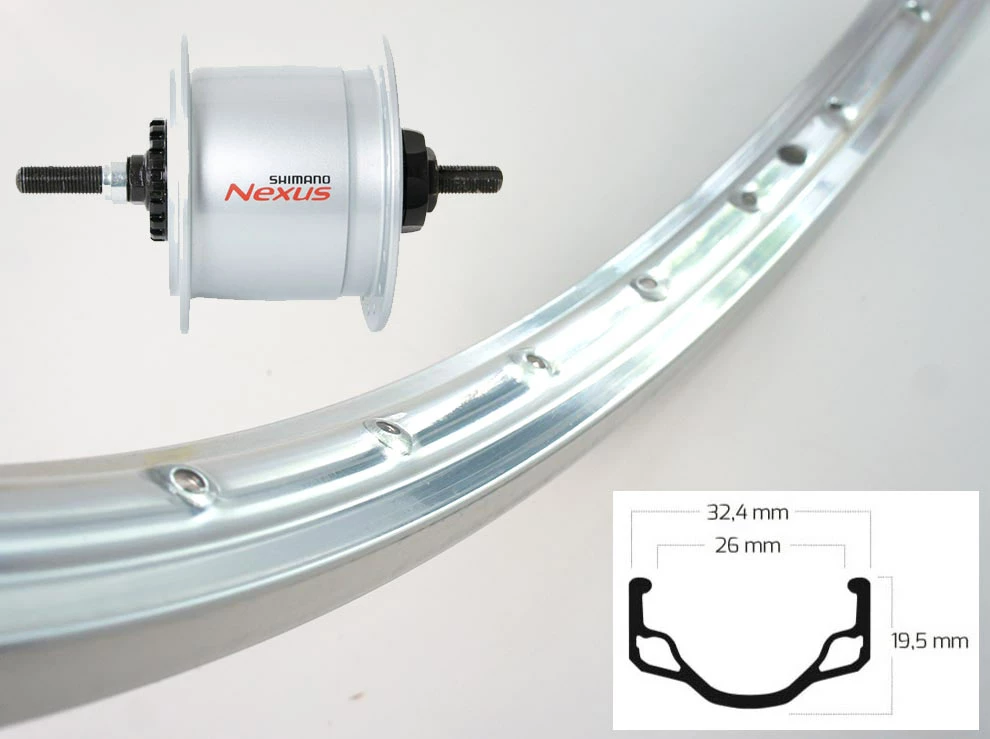 mit Shimano Nabendynamo Nexus DH-C6000 für Shimano Rollenbremse, mit Vollachse inkl. 2 Muttern und Dynamostecker, für Gabelweite 100 mm, 6V, 3W